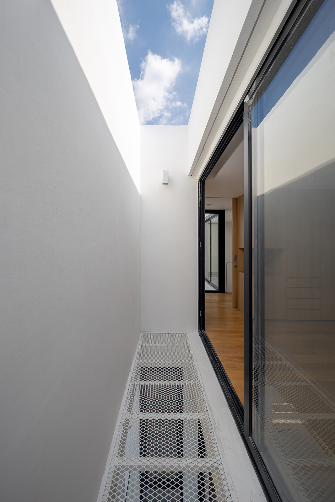 โถงสูงบริเวณชั้นสองเอื้อพื้นที่ขนาดเล็กเพื่อเป็นส่วนของพื้นที่ทำงานและนั่งเล่นที่ไร้เครื่องปรับอากาศ โดยที่โถงนี้เปิดเปิดรับเจ้าของบ้านจากการทำงานที่เหน็ดเหนื่อยในวันทำงาน โถงเล็กๆสร้างความเชื่อมต่อระหว่างพื้นที่ชั้นสองกับทางเดินเข้าห้องนอน รวมถึงลานซักล้างที่อยู่บนระเบียง ทั้งนี้ยังมอบแสงธรรมชาติจากทุกช่วงเวลาของวันโดยเฉพาะช่วงบ่ายที่แสงจะลอดเร้นจากอิฐช่องลมรูปสี่เหลี่ยมคางหมูช่วยให้พื้นที่น้อยๆนี้มีคุณค่าขึ้นมาในยามพระอาทิตย์อัศดง ทั้งที่บ้านหลังเล็กขนาดนี้การมีโถงแบบนี้คงดูขัดกับการใช้สอยพื้นที่ขนาดเล็กให้คุ้มค่าบนชั้นสาม แต่ด้วยเจตนาของบ้านหลังนี้คือการมอบคุณภาพชีวิตที่ดี มากกว่าเรื่องการใช้ทุกพื้นที่สร้างพื้นที่ใช้สอย