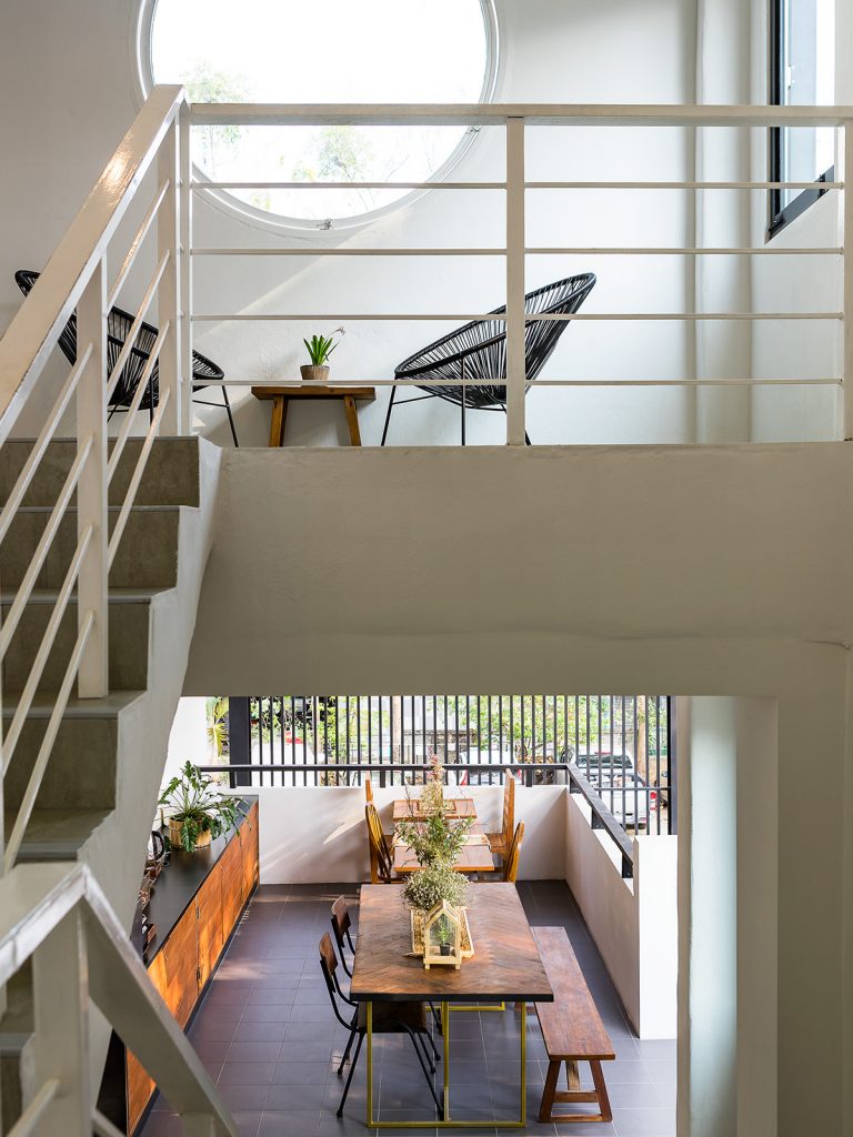 บริเวณชานชั้นสองออกแบบให้เป็นแชร์สเปซ ผู้พักสามารถนั่งทำงาน ดื่มกาแฟสด – สแน็คในตอนเช้าถึงเที่ยง และสามารถนั่งแฮงค์เอ้าท์ได้ในตอนเย็น ซึ่งบริเวณนี้สามารถมองเห็นวิวดอยสุเทพและพระอาทิตย์ตกดิน