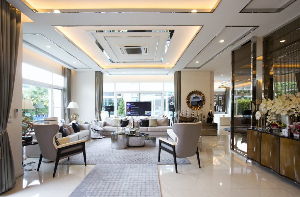 “บ้านเราแบ่งเป็นสองชั้นครับ มี 5 ห้องนอน และอีก 2 ห้องสำหรับแม่บ้าน ผมแพลนไว้ว่าอยากมีลูก 4 คน ดังนั้นก็เลยเลือกบ้านหลังนี้ที่ค่อนข้างใหญ่และมีพื้นที่ให้ขยับขยายได้อีกในอนาคต บริเวณชั้นล่างก็จะมีห้อง Living Room ที่ใหญ่มากอยู่ตรงกลางบ้าน ซึ่งโดยรวมของบ้านผมอยากให้อินทีเรียร์เป็นอะไรที่ดูหราหรา แต่ก็ดูสบาย น่าอยู่ เพราะผมเคยมีประสบการณ์จากบ้านหลังเก่าซึ่งตกแต่งทุกอย่างให้เป็นสีดำตามที่เราชอบ ผลที่ออกมาคือบรรยากาศจะดูทึมๆ จนใครๆ ที่มาบ้านเราแล้วต่างพูดเป็นเสียงเดียวกันว่าเหมือนอยู่ในผับมากกว่าอยู่บ้าน ซึ่งหลังจากลงตัวกับการตกแต่งในแบบโปร่งสบายแล้ว ผมกับภรรยา (คุณนิวเคลียร์) ตกลงกันว่าเราจะไม่ซื้อข้าวของที่เป็นความชอบส่วนตัวมาตกแต่งในส่วนนี้อีก อยากให้ตรงนี้เป็นพื้นที่สำหรับทุกคนจริงๆ” ระหว่างพูดคุย คุณเพชรจ้าก็พาเดินสำรวจชมบ้านไปด้วย เราสังเกตเห็นห้องโถงสูงใหญ่ High Ceiling & Double Volume ที่มองทะลุได้ถึงสองชั้นของบ้าน เป็นส่วนที่สร้างความรู้สึกโอ่โถงขึ้นไปอีก ถัดจาก Living Room ก็จะเป็นโซน Grand Dinning Area ขนาดใหญ่ ซึ่งตรงบริเวณนี้ที่สะดุดตาคือเปียโนหลังใหญ่ที่วางอยู่ใกล้ๆ กัน จึงรู้สึกแปลกใจว่ามาดแบดบอยแบบนี้ คุณเพชรจ้าจะเป็นคนเล่นเปียโนหลังนี้เองหรือไม่