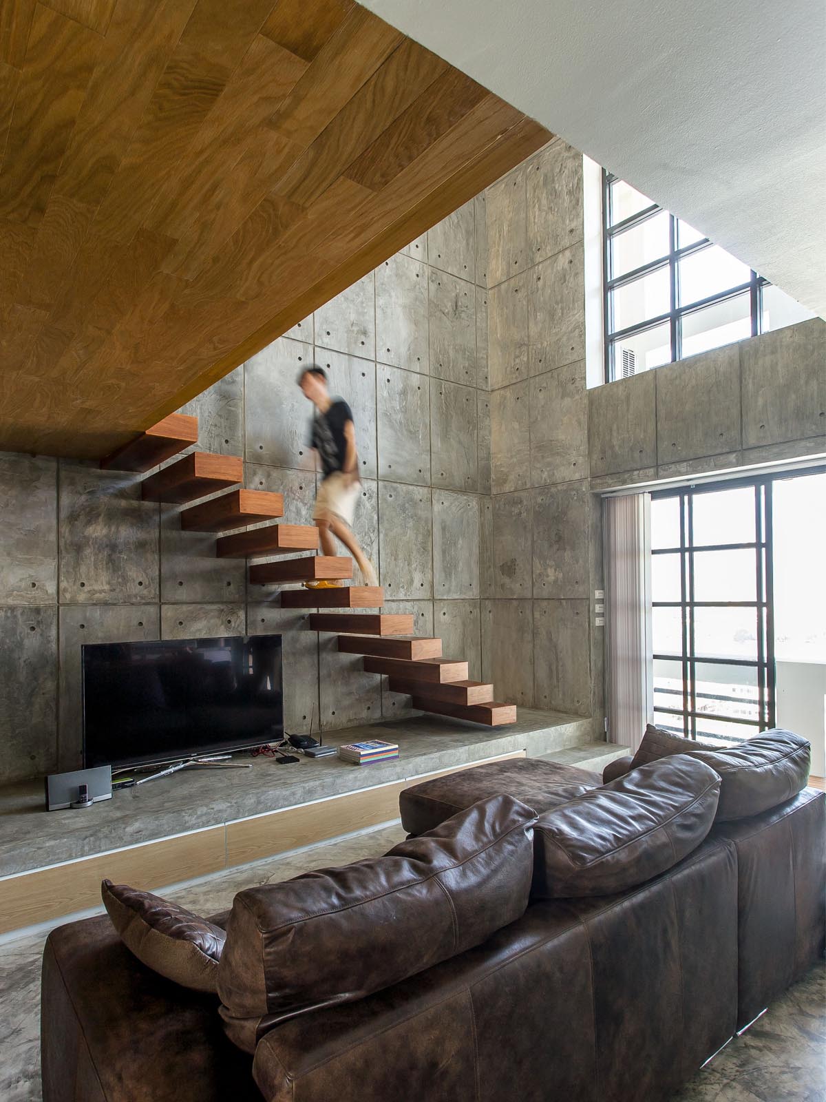 ผนังฉาบปูนเปลือยขัดมันด้านที่รับน้ำหนักของบันไดลอย มีการเพิ่มแนวเซาะร่องทั่วผนังเพื่อลดปัญหาทางเทคนิคการฉาบของช่างให้น้อยที่สุด ทั้งยังเป็นการเพิ่มรายละเอียดและผิวสัมผัสให้ผนังมีความน่าสนใจมากยิ่งขึ้นอีกด้วย ส่วนผนังด้านทิศตะวันตกมีการติดตั้งวงกบหน้าต่างกรุหน้าบานกระจกใส เพื่อเปิดรับแสงจากด้านนอกเข้าสู่ด้านใน ซึ่งจะช่วยเพิ่มความโปร่งสบายให้โถงบันไดแบบดับเบิ้ลสเปซและพื้นที่ใช้สอยด้านล่างทั้งหมดได้ดี