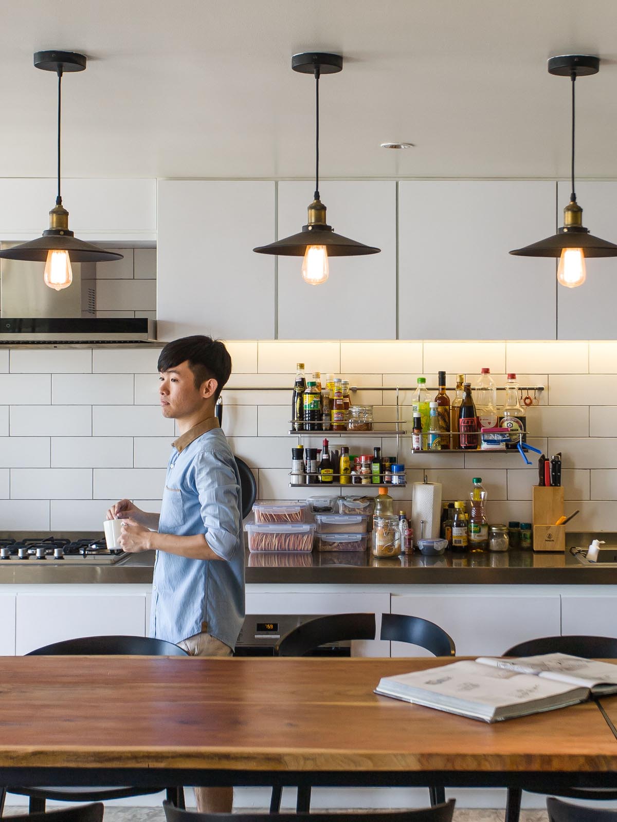 มุมครัวภายในห้องคุมโทนด้วยสีขาวดูสะอาดตา ออกแบบชุดครัวบิลท์อินท็อปสแตนเลส เพื่อฟังก์ชันการใช้งานที่สมบุกสมบันและง่ายต่อการจัดการดูแลรักษาส่วนโต๊ะรับประทานอาหารสั่งทำพิเศษจากไม้มะค่า ขนาด 75 x 80 x 90 ออกแบบโดย Fattstudio เช่นกัน