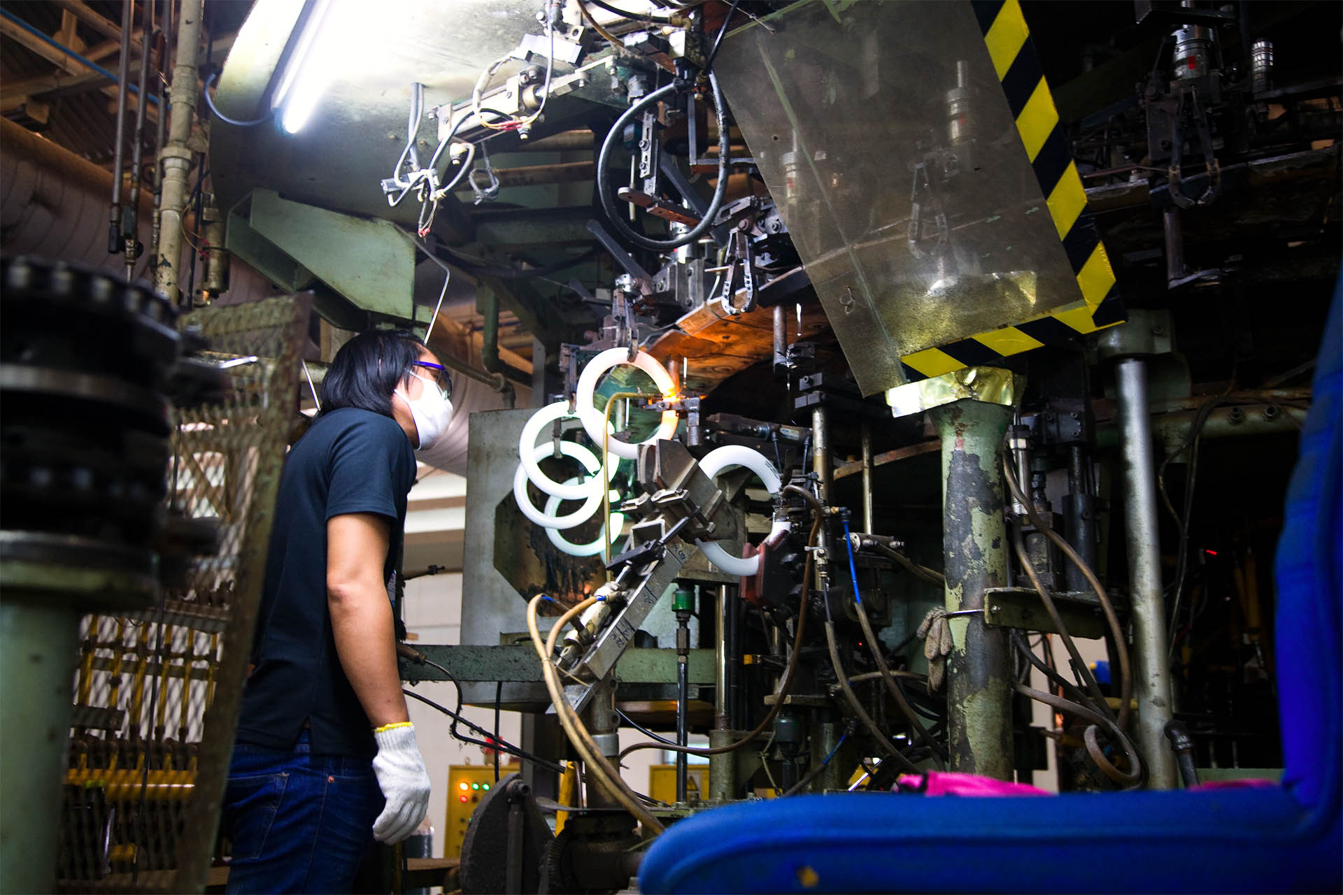 กระบวนการทำงานร่วมกันระหว่างเครื่องจักรและฝีมือมนุษย์ภายในห้องประกอบหลอดไฟ ในส่วนโรงงานผลิตหลอดไฟ LED