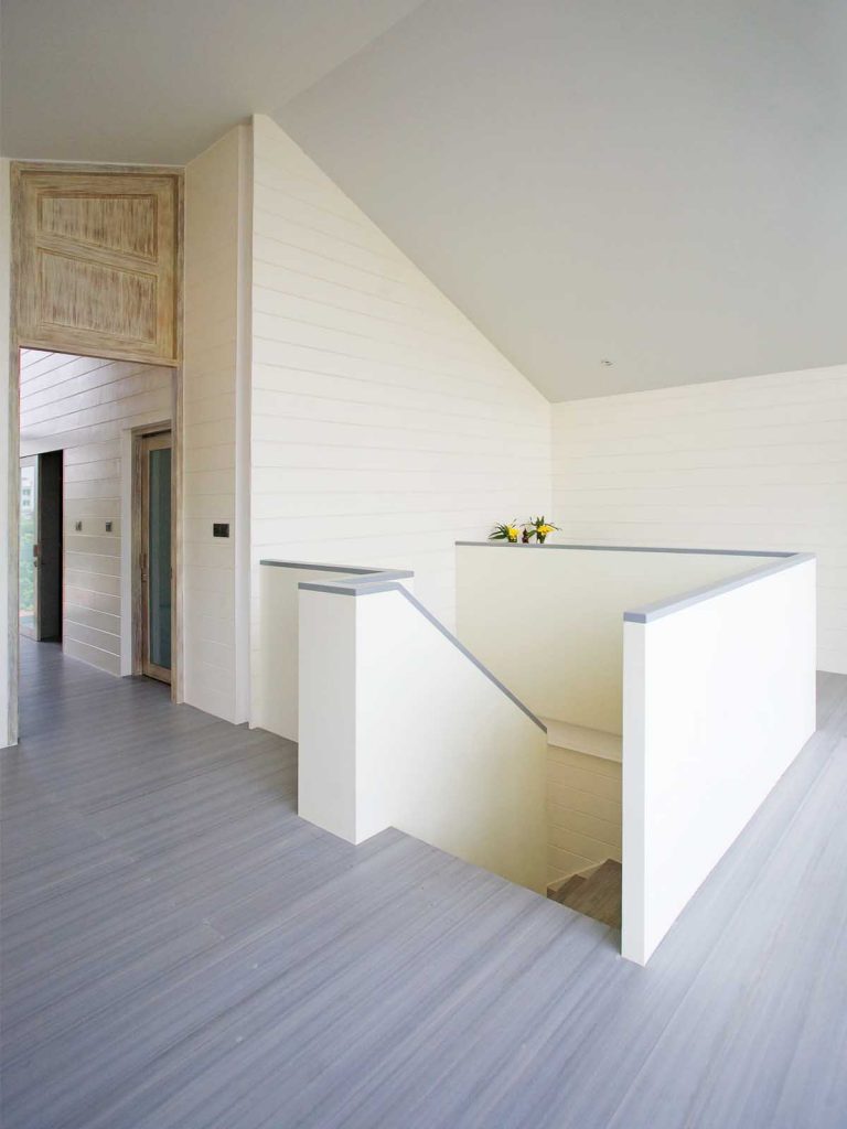 สำหรับผู้รับหน้าที่ออกแบบบ้านพักอาศัยสีขาวโพลนหลังนี้ ได้แก่ บริษัท สถาปนิก สุข จำกัด ซึ่งไม่เพียงแค่สร้างเอกลักษณ์เฉพาะให้กับรูปร่างอาคารหลังใหม่ที่จะเกิดขึ้นในชุมชนเท่านั้น แต่ยังคงคำนึงถึงความกลมกลืนกับบริบทของชุมชนไปด้วยพร้อมกันในคราวเดียว โดยสถาปนิกคงไว้ซึ่งลักษณะเช่นเดียวกับบ้านดั้งเดิมในหมู่บ้าน คือ เน้นความเรียบง่าย ผนังไม้ และหลังคาจั่ว ประกอบกับการก่อสร้างอาคารทั้ง 3 ชั้น ด้วยระบบโครงสร้างเหล็กรูปพรรณให้มีการซ้อนทับแบบเหลื่อมล้ำและถอยร่น เพื่อสร้างประโยชน์ทั้งโดยตรงและทางอ้อมให้กับผู้อยู่อาศัย