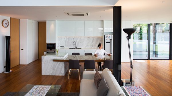 ผลงานออกแบบของ “คุณหย่ง-ศิริวัฒน์ ปัจฉิมะศิริ” และ “คุณเต้ย-เชาว์วัฒน์ กิตติธรกุล” สองสถาปนิกแห่ง “STUDIO MAHUTSACHAN” ซึ่งสะท้อนให้เห็นระบบความคิดอันลึกซึ้งในการสร้างสรรค์บ้านเดี่ยวชั้นเดียวออกมาให้ดูเรียบง่าย ผ่านวิธีคิดที่แปลกใหม่ เสมือนแต่ละพื้นที่ถูกบรรจุอยู่ในกล่องแต่ละใบ ทว่าเปิดเผย ไม่ปิดกั้น เน้นการปฏิสัมพันธ์ระหว่างคนในครอบครัว