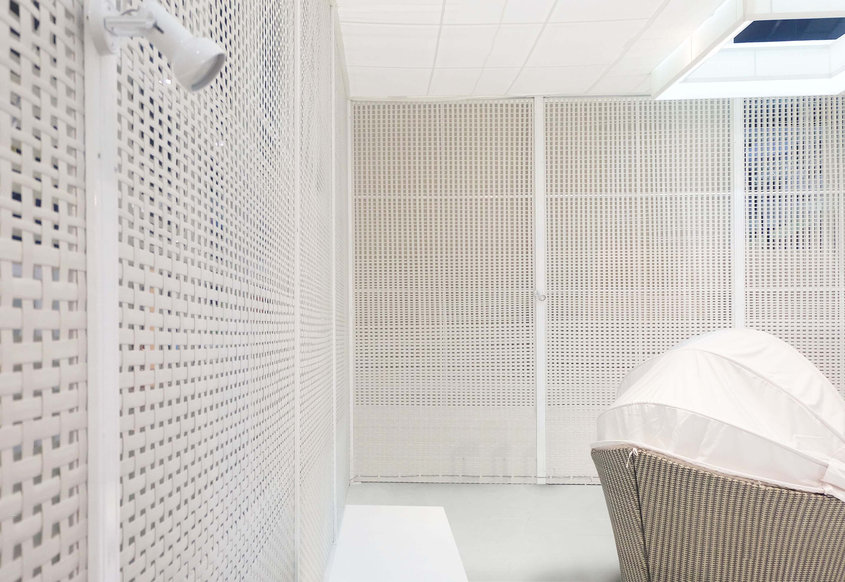 รูปแสดงถึงการเลือกใช้วัสดุพื้นฐานของแบรนด์สินค้า Hawaii thai คือเส้นพลาสติกหวายเทียมที่ sizing ต่างกันมาสานเป็น pattern gradient ตามแบบเพื่อให้ตัวผนังของบูทสินค้ามีความโปร่งและเบาสามารถมองทะลุไปได้แต่ในขณะเดียวกันก็จะสะดุดตากับผนังไปพร้อมๆ กัน ส่วนตัวฝ้าเพดานของบูทใช้ผ้าซึ่งเป็นวัสดุพื้นฐานที่ทาง Hawaii thai มีอยู่แล้วเหมือนกันมาทำ ซึ่งข้อดีของมันคือ น้ำหนักเบา ติดตั้งและรื้อถอนง่าย สร้างความโปร่งเบาให้ตัวบูทไปด้วยกัน